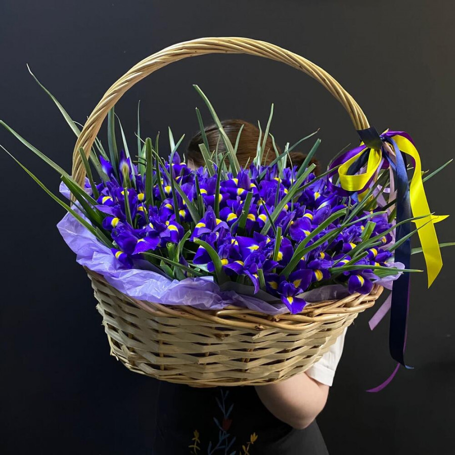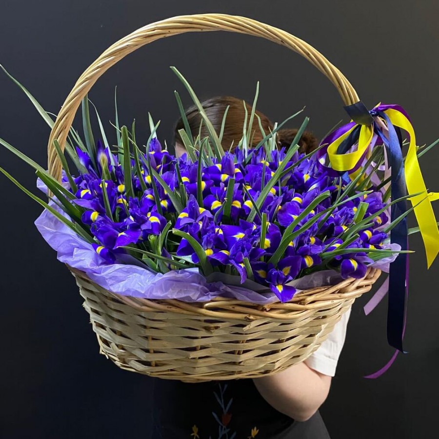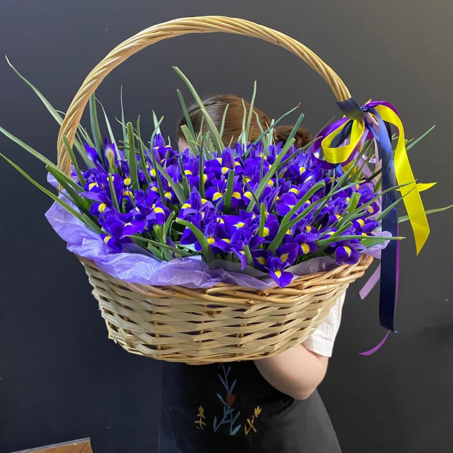 101 синий ирис в плетенной корзине в Белебее