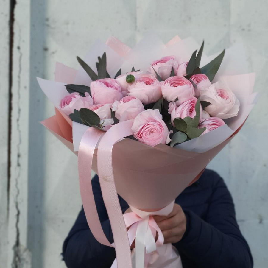 На фото букет из 15 розовых ранункулюсов. В составе: ранункулюс 15 шт, эвкалипт 2 шт, дизайнерская упаковка 1 шт, атласная лента 1 шт, . Все цветы свежие и ароматные, букет красиво оформлен и отлично подходит для подарка. Доступна доставка цветов или самовывоз.