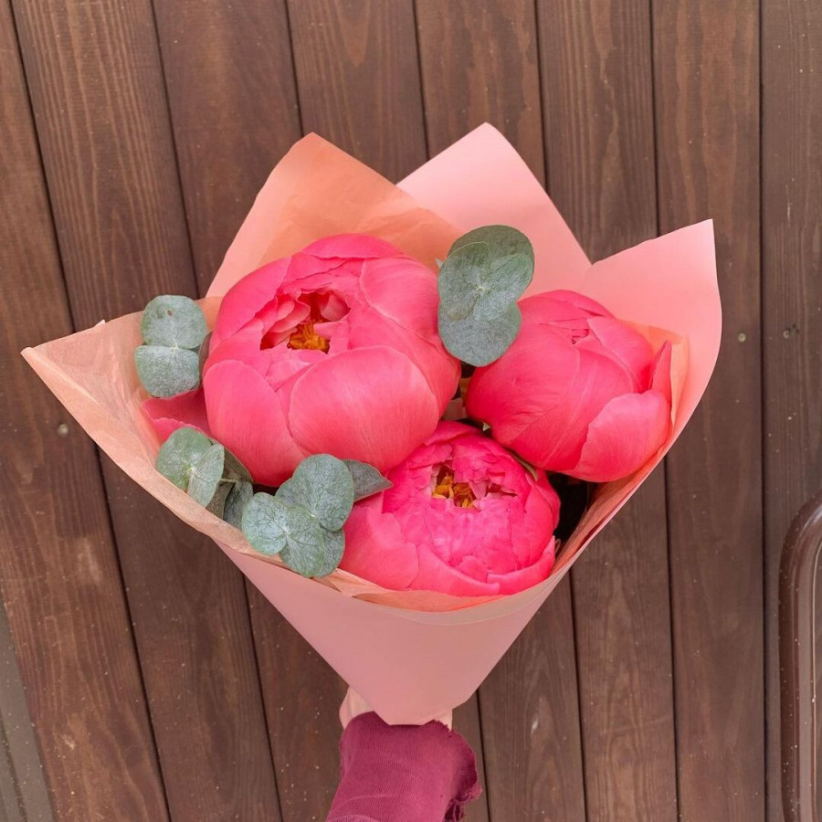 На фото букет из 3 коралловых пионов. В составе: пион 3 шт, эвкалипт 1 шт, крафт-бумага 1 шт, атласная лента 1 шт, . Все цветы свежие и ароматные, букет красиво оформлен и отлично подходит для подарка. Доступна доставка цветов или самовывоз.