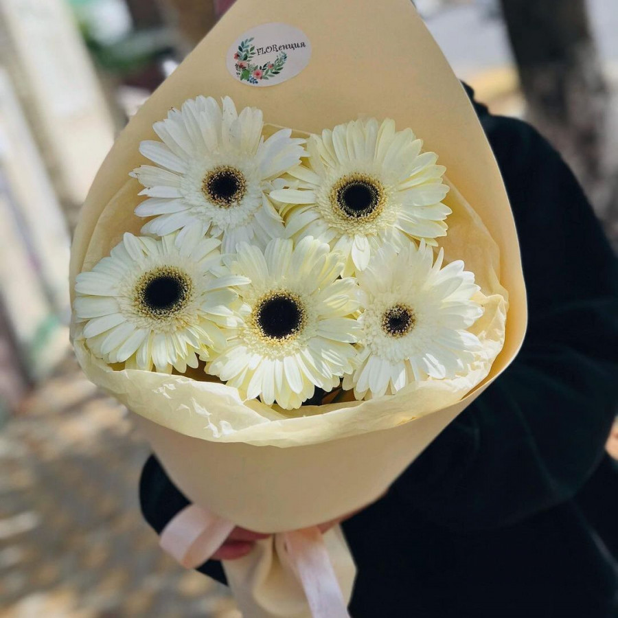 На фото букет из 5 белых гербер. В составе: гербера 5 шт, крафт-бумага 1 шт, атласная лента 1 шт, . Все цветы свежие и ароматные, букет красиво оформлен и отлично подходит для подарка. Доступна доставка цветов или самовывоз.