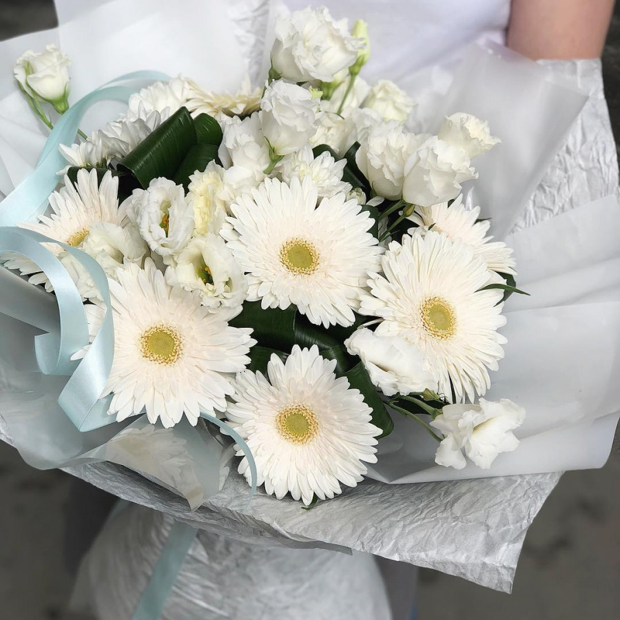 На фото букет из белых гербер и эустомы. В составе: гербера 5 шт, эустома (лизиантус) 7 шт, крафт-бумага 1 шт, атласная лента 1 шт, . Все цветы свежие и ароматные, букет красиво оформлен и отлично подходит для подарка. Доступна доставка цветов или самовывоз.